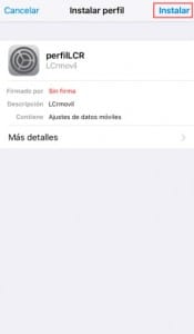 3. Instalar el fichero: Antes de instalar te saldrá un aviso de que el perfil no está firmado. Instalar igualmente.